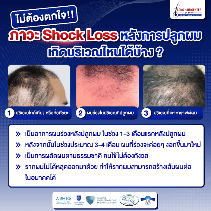 อย่างไรก็ตาม ไม่ต้องกังวล! ผมที่ร่วงไปนั้นเป็นเพียงส่วนของเส้นผม ไม่ใช่รากผม รากผมที่ถูกปลูกยังคงแข็งแรงและจะเริ่มผลิตเส้นผมใหม่ในอีกไม่กี่เดือนข้างหน้า ที่ The Skin Clinic เรายังมีเทคนิคที่ช่วยลดการ Shock Loss หรือ ผมร่วงหลังปลูก ด้วย