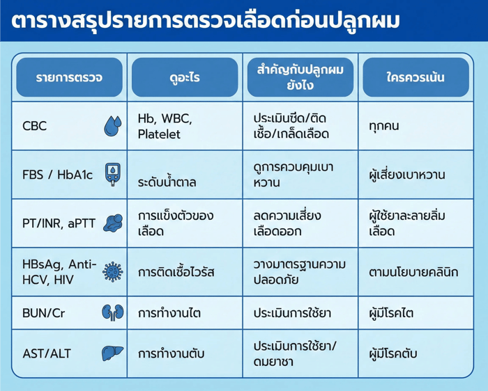 ตรวจเลือดก่อนปลูกผมมีเป้าหมายเพื่อประเมินความปลอดภัย ไม่ใช่เพื่อผลลัพธ์ด้านความหนาแน่นผม รายการที่พบบ่อย ได้แก่ CBC น้ำตาล การทำงานของตับและไต และบางกรณีตรวจการแข็งตัวของเลือดหรือคัดกรองการติดเชื้อ ความจำเป็นขึ้นกับโรคประจำตัว ยาที่ใช้ และดุลยพินิจแพทย์