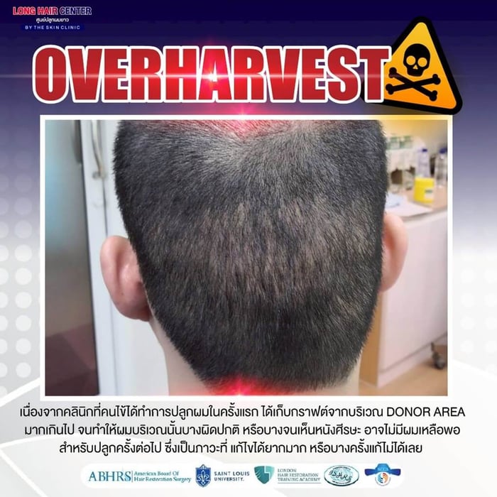 ตัวอย่างเคสคนไข้ของ The Skin Clinic ปลูกผมจากคลินิกปลูกผมอื่นมา มีปัญหาผมร่วงเพิ่ม แต่ไม่อยากปลูกผมอีก เป็นเคสที่ทำการแก้ไขได้ค่อนข้างยากพอสมควร เนื่องจากคลินิกปลูกผมที่คนไข้ได้ทำการปลูกผมในครั้งแรก ได้เก็บกราฟต์จากบริเวณด้านหลังศีรษะมากเกินไป จนทำให้ผมบริเวณนั้นบางผิดปกติ บางจนเห็นหนังศีรษะ หรือที่เรียกว่า Over – Harvesting ส่งผลให้ไม่มีผมเหลือพอสำหรับปลูกครั้งต่อไป ซึ่งเป็นภาวะที่แก้ไขได้ยากมาก หรือบางครั้งแก้ไขไม่ได้เลย แล้วเคสแบบนี้ จะทำการรักษาอย่างไร?