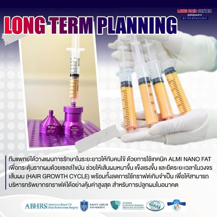 เนื่องจากบริเวณด้านหน้าศีรษะที่ดูบาง ยังมีเส้นผมเดิมเหลืออยู่ ทีมแพทย์ได้วางแผนการรักษาในระยะยาวให้กับคนไข้ โดยการใช้เทคนิค ALMI Nano Fat เพื่อกระตุ้นรากผมด้วยเซลล์ไขมันตัวเอง ช่วยให้เส้นผมหนาขึ้น แข็งแรงขึ้น และยืดระยะเวลาในวัฏจักรเส้นผม (Hair Growth Cycle) พร้อมทั้งลดการใช้กราฟต์เกินจำเป็น เพื่อให้สามารถบริหารทรัพยากรกราฟต์ผมได้อย่างคุ้มค่าสูงสุด สำหรับการปลูกผมในอนาคต