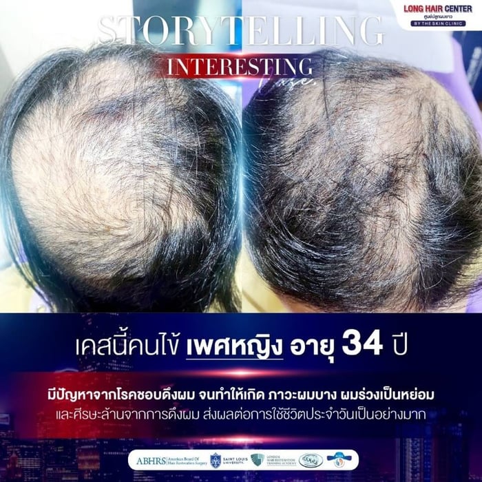 - เคสคนไข้เพศหญิง อายุ 34 ปี มีปัญหาจากโรคชอบดึงผมตัวเอง จนทำให้เกิดภาวะผมบาง ผมร่วงเป็นหย่อม และศีรษะล้าน ส่งผลต่อการใช้ชีวิตประจำวันเป็นอย่างมาก ก่อนอื่นจะต้องดูว่ารากผมตายแล้วหรือไม่? สำหรับเคสนี้หมอท๊อปได้ตรวจสภาพเส้นผมด้วยวิธี AI Scan รวมถึงตรวจเช็คว่าขาดวิตามินอะไรบ้าง เช่น ธาตุเหล็ก ไบโอติน และโฟลิก เพราะก่อนที่จะทำการรักษา หากรู้สาเหตุที่แท้จริงของปัญหาเส้นผม จะช่วยให้วางแผนและเลือกวิธีการรักษาได้อย่างตรงจุดมากขึ้น สำหรับเคสนี้นับว่าโชคดีมากที่คนไข้ยังมีผมเส้นเล็กๆ เหลืออยู่ สำหรับการรักษาหมอท๊อปไม่แนะนำให้ปลูกผมอย่างเด็ดขาด เนื่องจากสามารถกระตุ้นผมเส้นเล็กที่มีอยู่ให้งอกได้อย่างแข็งแรง
