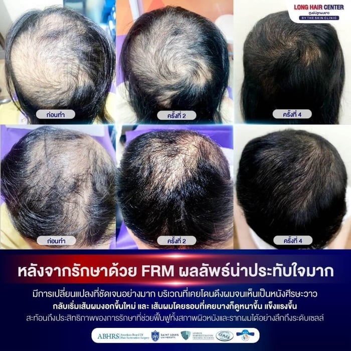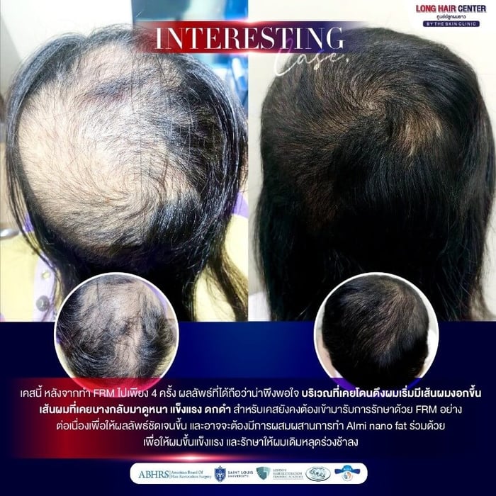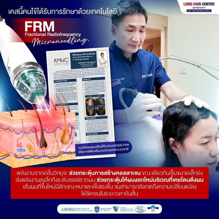 - สำหรับเคสนี้ คนไข้ได้รับการรักษาด้วยเทคโนโลยีที่เรียกว่า FRM (Fractional Radiofrequency Microneedling) เป็นเทคนิคที่ใช้พลังงานจากคลื่นวิทยุในการช่วยฟื้นฟูรากผมให้แข็งแรงขึ้น ขณะเดียวกันเข็มขนาดเล็กยังส่งพลังงานลงลึกถึงระดับเซลล์รากผม ช่วยกระตุ้นให้ผมงอกใหม่ในบริเวณที่เคยโดนดึงผม ทำให้เส้นผมที่ขึ้นใหม่มีลักษณะหนาและแข็งแรงขึ้น จนสามารถสังเกตถึงความเปลี่ยนแปลงได้ชัดเจนในระยะเวลาอันสั้น หลังจากทำ FRM ไปเพียง 4 ครั้ง สะท้อนถึงประสิทธิภาพในการรักษาที่ช่วยฟื้นฟูทั้งสภาพผิวหนังและรากผมได้ลึกถึงระดับเซลล์ สำหรับเคสนี้ยังคงต้องเข้ามารับการรักษาด้วยเทคนิค FRM อย่างต่อเนื่อง เพื่อให้ผลลัพธ์ชัดเจนขึ้น และอาจจะต้องมีการผสมผสานการรักษาด้วยเทคนิค ALMI Nano Fat ร่วมด้วย เพื่อให้ผมงอกใหม่แข็งแรงขึ้น และรักษาเส้นผมเดิมให้หลุดร่วงช้าลง