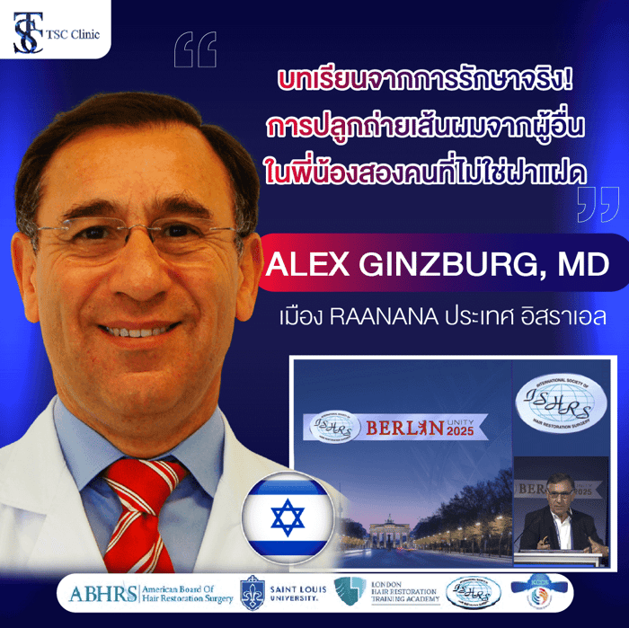 Dr. Alex Ginzburg เมือง Raanana ประเทศอิสราเอล กับผลงานบทเรียนจากการรักษาจริง! การปลูกถ่ายเส้นผมจากผู้อื่น ในพี่น้องสองคนที่ไม่ใช่ฝาแฝด เคสผู้ป่วยโรคผิวหนังอักเสบที่ทำลายรากผม ทำให้ผมร่วงถาวร (Lichen Planus Pilaris) หลังจากคนไข้ได้เข้ารับการปลูกผม (จากเซลล์รากผมตัวเอง) ใช้จำนวนกราฟต์ทั้งสิ้น 3,500 กราฟต์ พอผ่านไป 1 ปี ผลลัพธ์ออกมาดี แต่หลังจากปลูกผมได้ 4 ปี สภาพเส้นผมเริ่มแย่ลง ผมบางอย่างเห็นได้ชัด คนไข้จึงกลับมาพบแพทย์อีกครั้ง โดยในครั้งนี้มีแผนจะใช้เส้นผมจากผู้บริจาคซึ่งเป็นน้องชายของคนไข้เอง แพทย์ได้ทำการทดสอบโดยใช้จำนวนกราฟต์เพียงเล็กน้อยประมาณ 20 กราฟต์ เพื่อประเมินการรักษา หลังปลูกผม 1 สัปดาห์พบว่ายังไม่มีปฏิกิริยาอะไร หลังปลูก 10 เดือน