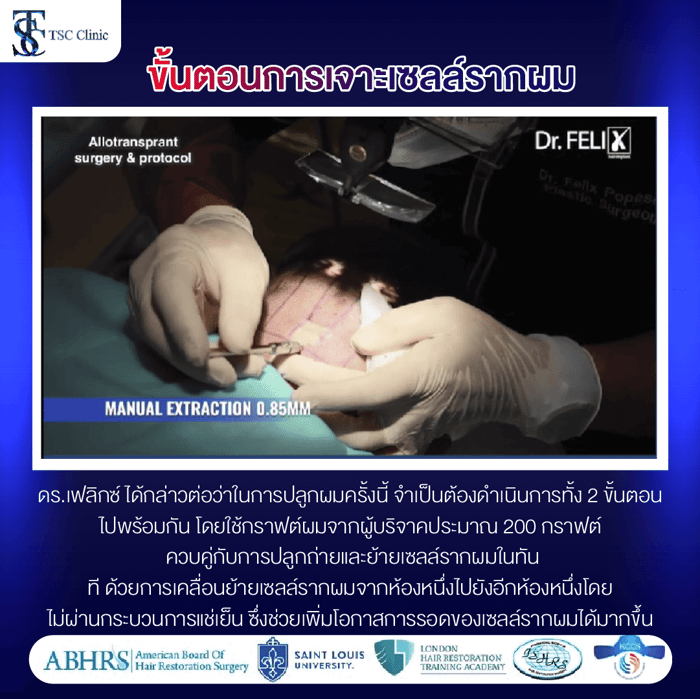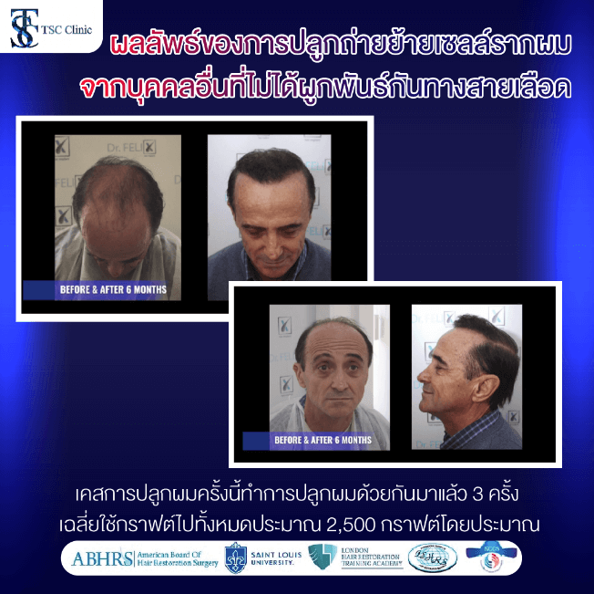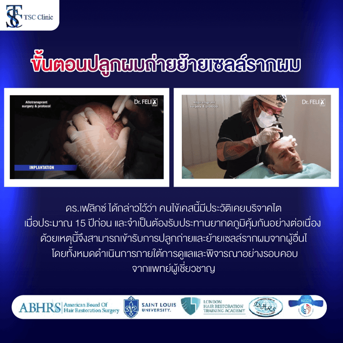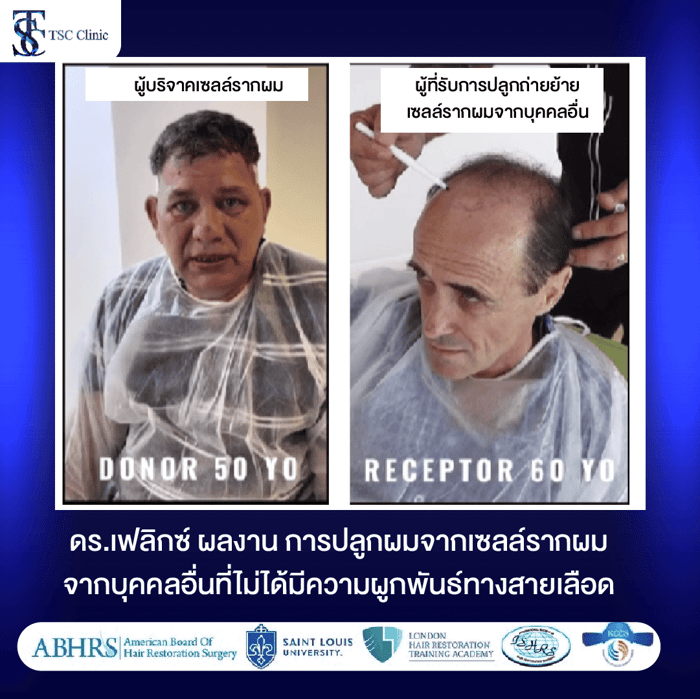 Dr. Felix Mircea Popescu กับผลงานการใช้เส้นผมของคนอื่นปลูกผมโดยที่ไม่ได้มีความผูกพันธ์ทางสายเลือด Dr. Felix ได้กล่าวไว้ว่า คนไข้เคสนี้มีประวัติเคยรับการบริจาคไตเมื่อประมาณ 15 ปีก่อน และจำเป็นต้องรับประทานยากดภูมิคุ้มกันอย่างต่อเนื่อง ด้วยเหตุนี้จึงสามารถเข้ารับการปลูกถ่ายและย้ายเซลล์รากผมจากผู้อื่น โดยทั้งหมดดำเนินการภายใต้การดูแลและพิจารณาอย่างรอบคอบจากแพทย์ผู้เชี่ยวชาญ