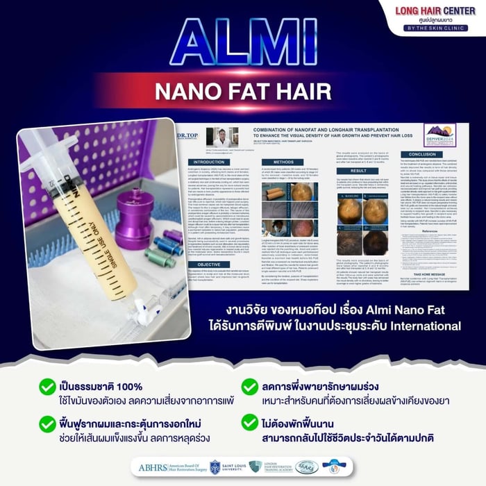 นวัตกรรมที่เป็นหัวใจสำคัญที่หมอท๊อปนำไปเผยแพร่ในงานประชุมวิชาการทั่วโลกคือ นาโนแฟต (Nanofat) เทคนิคเวชศาสตร์ฟื้นฟูรากผมที่ใช้ไขมันจากคนไข้เองมาผ่านกระบวนการ เพื่อให้ได้ไขมันโมเลกุลที่มีขนาดเล็ก แล้วนำไปฉีดบริเวณหนังศีรษะที่มีปัญหาเส้นผม ช่วยฟื้นฟูเซลล์รากผมที่อ่อนแอให้กลับมาแข็งแรง และชะลอการหลุดร่วงของเส้นผมในระยะยาว ซึ่งการทำ Nanofat ร่วมกับการปลูกผมสามารถช่วยเพิ่มอัตราการรอดชีวิตของกราฟต์ผมที่ปลูก และช่วยเสริมประสิทธิภาพความแข็งแรงของเส้นผมเกิดใหม่ให้คงอยู่ได้นานและสมบูรณ์