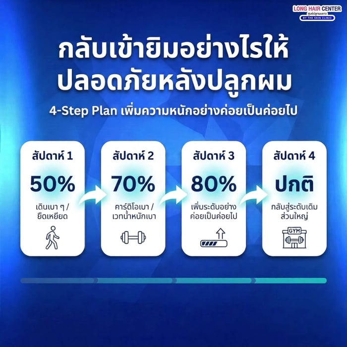 ⚠️ ช่วงเวลาการกลับมาออกกำลังกายเป็นเพียงแนวทางทั่วไป ระยะเวลาจริงอาจแตกต่างกันตามเทคนิค จำนวนกราฟต์ การดูแลหลังทำ และดุลยพินิจแพทย์