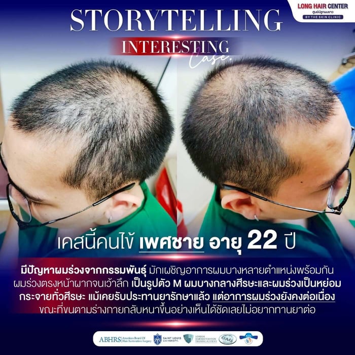 เคสคนไข้เพศชาย อายุ 22 ปี มีปัญหาผมร่วงจากกรรมพันธุ์ เผชิญอาการผมบางหลายตำแหน่งพร้อมกัน ผมร่วงบริเวณหน้าผากจนเว้าลึกเป็นรูปตัว M ผมบางกลางศีรษะและผมร่วงเป็นหย่อมกระจายทั่วศีรษะ แม้เคยรับประทานยารักษาแล้ว แต่อาการผมร่วงยังคงต่อเนื่อง ขณะที่ขนตามร่างกายกลับหนาขึ้นอย่างชัดเจน จึงไม่ต้องการทานยาต่อ เคสนี้ควรรักษาปัญหาเส้นผม อย่างไรดี?