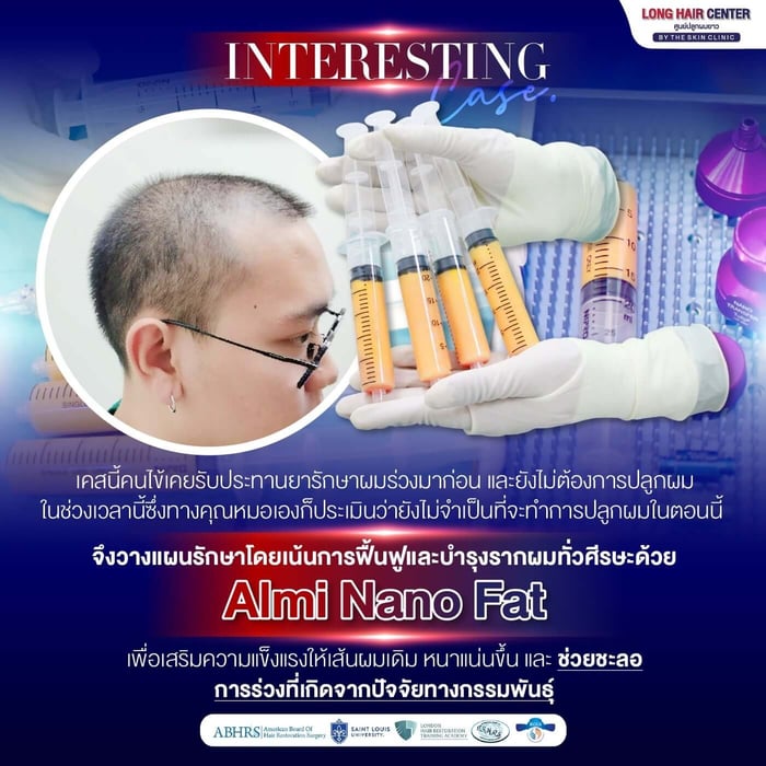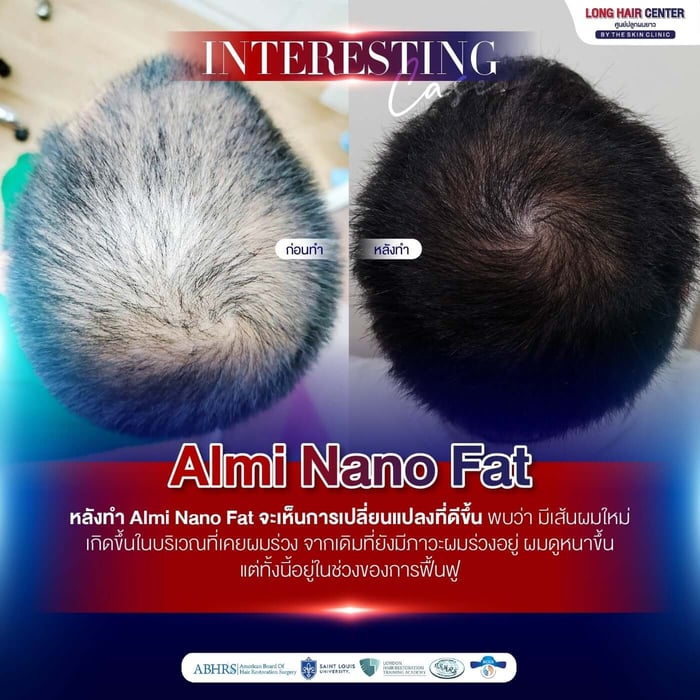 ALMI Nano Fat เทคนิคที่ช่วยกระตุ้นรากผม และฟื้นฟูหนังศีรษะให้แข็งแรงด้วยไขมันตัวเอง ทางเลือกสำหรับผู้ที่ไม่ต้องการทานยาในระยะยาว หรือกังวลผลข้างเคียงจากการทานยา เห็นผลตั้งแต่ครั้งแรกที่ทำ หมดกังวลเรื่องอาการแพ้เนื่องจากใช้ไขมันของตัวเอง เป็นเทคนิคที่มีงานวิจัยรองรับว่า ช่วยเพิ่มชั้นไขมันใต้หนังศีรษะ ทำให้เลือดไหลเวียนมายังรากผมมากขึ้น ชะลอการหลุดร่วง และกระตุ้นการงอกใหม่ของเส้นผม