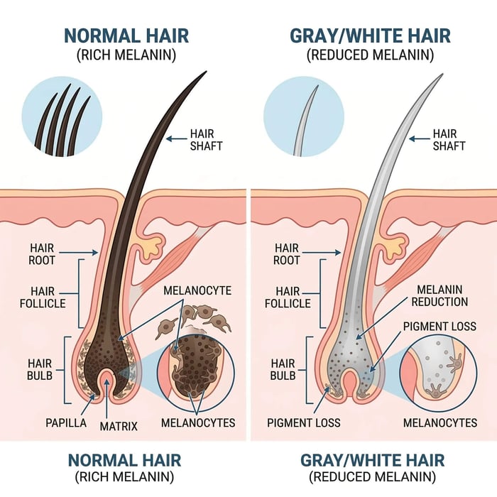 ผมหงอกเกิดจากการลดลงของ เม็ดสีเมลานิน (Melanin) ซึ่งเป็นสารที่ทำให้เส้นผมมีสี เมื่ออายุมากขึ้น เซลล์ที่ผลิตเมลานินในรากผมจะค่อย ๆ ลดลง ทำให้เส้นผมเปลี่ยนจาก สีดำ สีน้ำตาล กลายเป็น สีเทา สีขาว