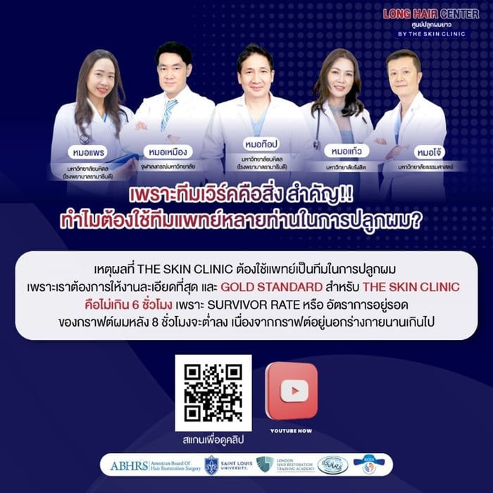 แม้การปลูกผมจะให้ผลลัพธ์ที่ดูเป็นธรรมชาติและถาวร อย่างไรก็ตามความชำนาญของแพทย์ถือเป็นสิ่งสำคัญอย่างยิ่งในการปลูกผม ที่ The Skin Clinic คลินิกปลูกผม รักษาโดยทีมแพทย์ปลูกผมอเมริกันบอร์ด (ABHRS) ที่มีประสบการณ์ยาวนานกว่า 20 ปี และความสำเร็จในการรักษามากกว่า 10,000 เคส มีบริการที่ครอบคลุมทุกการรักษาเรื่องเส้นผมแบบครบวงจร มั่นใจได้ว่าคุณจะได้รับการรักษาที่ดีและมีความปลอดภัยมากที่สุด