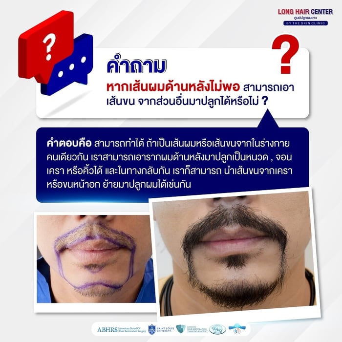 หนวดเคราเยอะ แต่ทำไมศีรษะล้าน? คำถามชวนสงสัยที่เเทป็นปัญหาหนักใจของผู้ชายหลายคน โดยเฉพาะคนที่ผมร่วงลามไปทั่วหนังศีรษะ จนกังวลว่าเส้นผมบนศีรษะอาจมีไม่เพียงพอต่อการปลูกผมถาวร มีความเป็นไปได้หรือไม่ ที่จะสามารถใช้เส้นขนบริเวณอื่นในร่างกาย จะใช้เส้นขนจากส่วนไหนได้บ้าง ผลลัพธ์ที่ได้เป็นอย่างไร มีข้อจำกัดอะไรบ้าง ใครที่กำลังมีคำถามเรื่องนี้อยู่เรามาทำความเข้าใจกันเลย