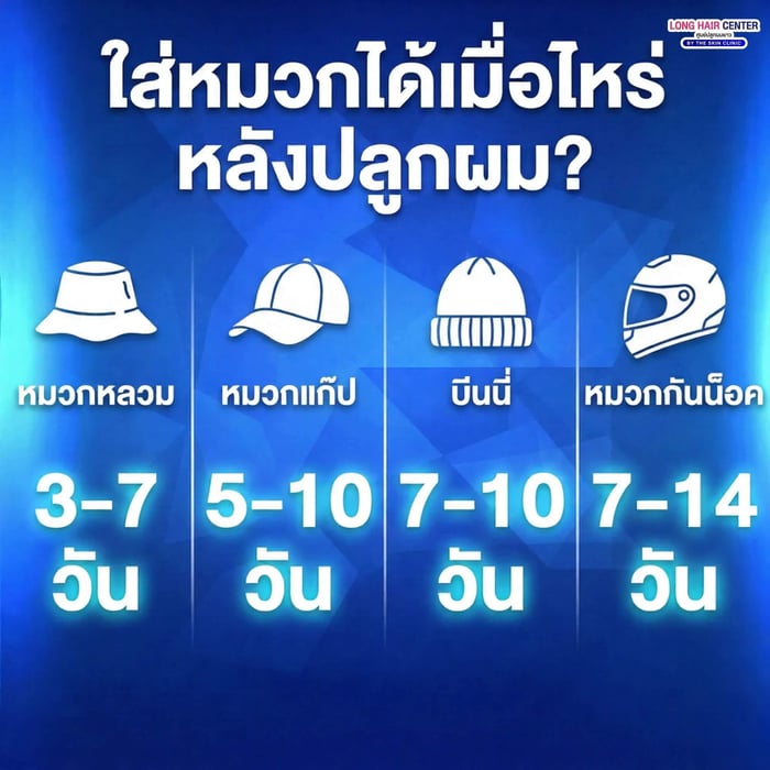 โดยทั่วไป หลังปลูกผมสามารถใส่หมวกหลวม ๆ ได้ประมาณ 3–7 วัน และหมวกกันน็อคควรรออย่างน้อย 7–14 วัน ทั้งนี้ขึ้นกับเทคนิคที่ใช้ (FUE/FUT) จำนวนกราฟต์ อาการบวม และการเสียดสีจากหมวก ควรเลือกหมวกที่หลวม สะอาด และหลีกเลี่ยงแรงกดทับบริเวณปลูกในช่วงแรก