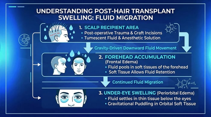 สาเหตุหลักเกิดจาก แรงโน้มถ่วงของของเหลวใต้ผิวหนังระหว่างการปลูกผม แพทย์อาจใช้ของเหลวบางชนิดเพื่อช่วยให้การปลูกผมเป็นไปอย่างราบรื่น ของเหลวเหล่านี้อาจเคลื่อนตัวลงตามแรงโน้มถ่วง ทำให้เกิดอาการบวมบริเวณหน้าผาก