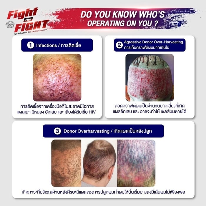 หากปลูกผมกับคลินิกที่ไม่ได้มาตรฐาน หรืออย่างใน Black Market ที่มีการใช้เครื่องมือซ้ำ โดยที่ไม่ได้เปลี่ยนใหม่ทุกครั้ง ทำให้เสี่ยงต่อการติดเชื้อจากเครื่องมือที่ไม่สะอาด มีโอกาสเกิดแผลเน่า มีหนอง อักเสบ และเสี่ยงได้รับเชื้อ HIV ไวรัสตับอักเสบ การบันทึก VDO เพื่อให้เห็นว่าหัวเจาะที่ใช้ถูกแกะออกมาจากซอง โดยที่ไม่เคยผ่านการใช้งานมาก่อนเกิดแผลเป็นหลังปลูก (Donor overharvesting)