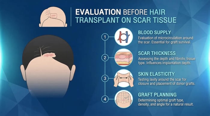 ก่อนทำการปลูกผมบนแผลเป็น แพทย์ต้องประเมินหลายปัจจัยเพื่อให้ผลลัพธ์ดีที่สุด