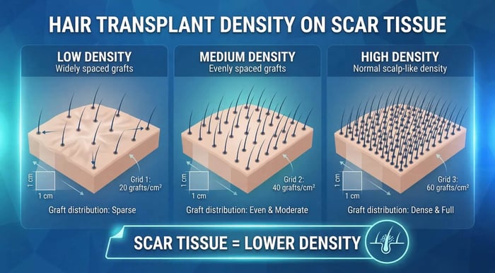 อย่างไรก็ตาม การปลูกผมบนแผลเป็น มีความซับซ้อนกว่าการปลูกผมบนผิวปกติ เพราะเนื้อเยื่อแผลเป็นมีลักษณะเฉพาะ เช่น การไหลเวียนเลือดที่ลดลง ความยืดหยุ่นของผิวที่เปลี่ยนไป และความหนาแน่นของเส้นเลือดที่แตกต่างจากหนังศีรษะปกติ
