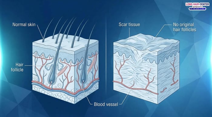 สาเหตุหลักที่ทำให้การปลูกผมบนแผลเป็นยากกว่าปกติคือ โครงสร้างของผิวหนังที่เปลี่ยนไป