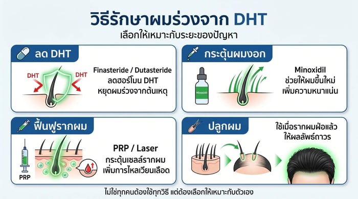 DHT หยุดได้ “ในระดับหนึ่ง” แต่ไม่ใช่ 100% เพราะ DHT เป็นฮอร์โมนที่ร่างกายสร้างขึ้นตามธรรมชาติ และมีบทบาทในระบบฮอร์โมนโดยรวม ดังนั้นการรักษาจึงไม่ได้ “กำจัด DHT ทั้งหมด”