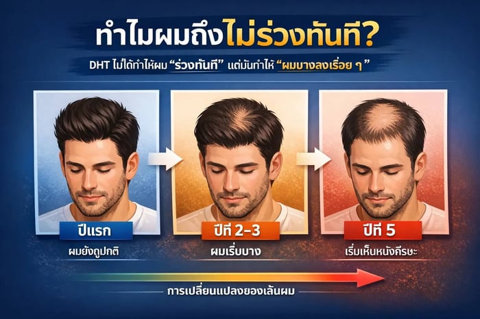 DHT ไม่ได้ทำให้ผม “ร่วงทันที” แต่มันทำให้ ผม “บางลงเรื่อย ๆ”