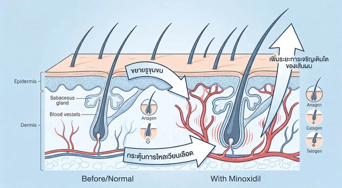Minoxidil เป็นยาที่ใช้รักษาผมร่วงและผมบาง โดยออกฤทธิ์ช่วยขยายหลอดเลือดบริเวณหนังศีรษะ ทำให้เลือดไหลเวียนดีขึ้น และช่วยกระตุ้นรากผมให้กลับมาอยู่ในระยะเจริญเติบโต (Anagen phase)
